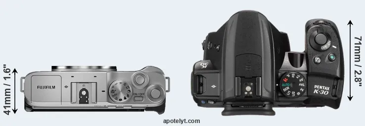 If the front view area (width x height) of the cameras is taken as an aggregate measure of their size, the Pentax K-30 is considerably larger (56 percent) than the Fujifilm X-A7. Moreover, the K-30 is substantially heavier (103 percent) than the X-A7. It is noteworthy in this context that the K-30 is splash and dust-proof, while the X-A7 does not feature any corresponding weather-sealing.