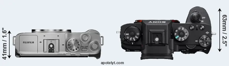 The physical size and weight of the Fujifilm X-A7 and the Sony A9 are illustrated in the side-by-side display below. The two cameras are presented according to their relative size. Three successive views from the front, the top, and the rear are shown. All width, height and depth measures are rounded to the nearest millimeter.