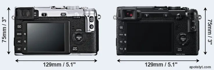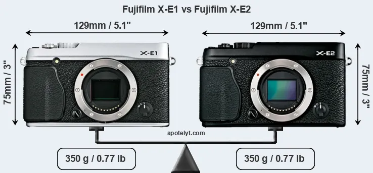The side-by-side display below illustrates the physical size and weight of the Fujifilm X-E1 and the Fujifilm X-E2. The two cameras are presented according to their relative size. Three consecutive perspectives from the front, the top, and the back are available. All width, height and depth measures are rounded to the nearest millimeter.