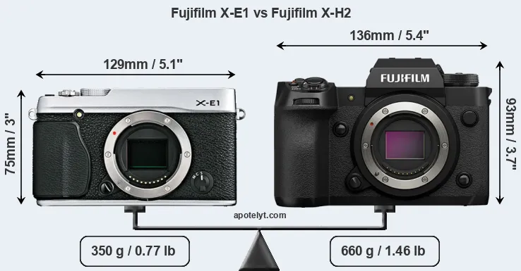If the front view area (width x height) of the cameras is taken as an aggregate measure of their size, the Fujifilm X-H2 is notably larger (31 percent) than the Fujifilm X-E1. Moreover, the X-H2 is substantially heavier (89 percent) than the X-E1. It is noteworthy in this context that the X-H2 is splash and dust-proof, while the X-E1 does not feature any corresponding weather-sealing.