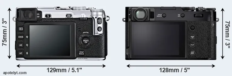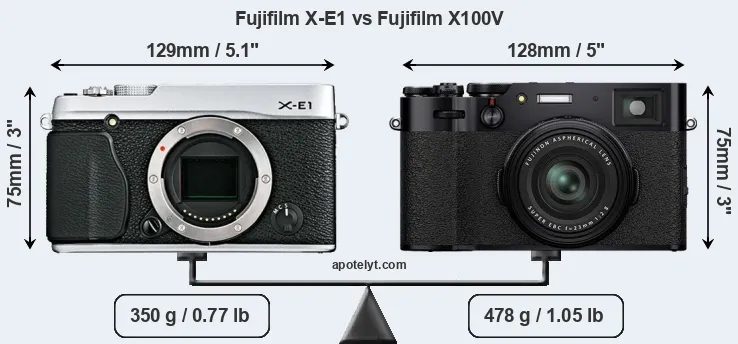The physical size and weight of the Fujifilm X-E1 and the Fujifilm X100V are illustrated in the side-by-side display below. The two cameras are presented according to their relative size. Three consecutive perspectives from the front, the top, and the back are available. All width, height and depth dimensions are rounded to the nearest millimeter.