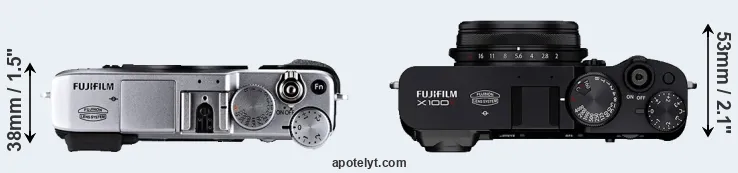 If the front view area (width x height) of the cameras is taken as an aggregate measure of their size, the Fujifilm X-E1 and the Fujifilm X100V are of equal size. It is noteworthy in this context that the X100V is splash and dust-proof, while the X-E1 does not feature any corresponding weather-sealing.