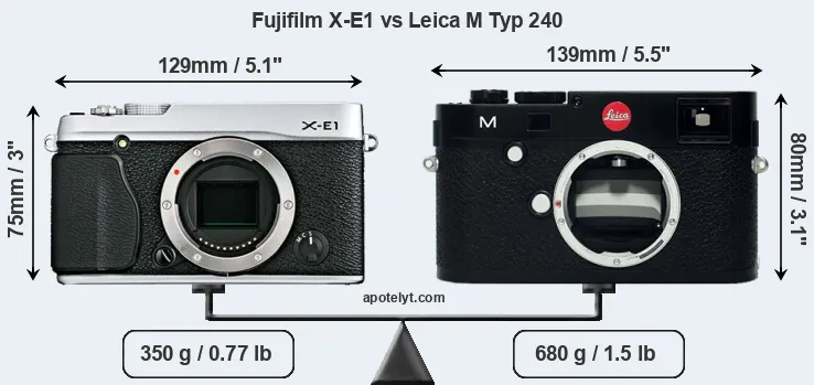 If the front view area (width x height) of the cameras is taken as an aggregate measure of their size, the Leica M Typ 240 is notably larger (15 percent) than the Fujifilm X-E1. Moreover, the M Typ 240 is substantially heavier (94 percent) than the X-E1. It is noteworthy in this context that the M Typ 240 is splash and dust-proof, while the X-E1 does not feature any corresponding weather-sealing.