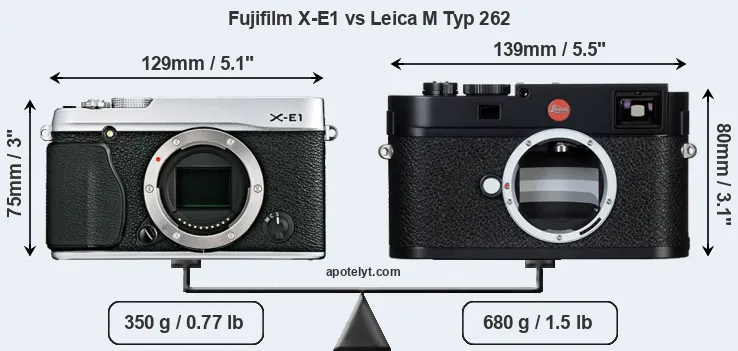 If the front view area (width x height) of the cameras is taken as an aggregate measure of their size, the Leica M Typ 262 is notably larger (15 percent) than the Fujifilm X-E1. Moreover, the M Typ 262 is substantially heavier (94 percent) than the X-E1. It is noteworthy in this context that the M Typ 262 is splash and dust-proof, while the X-E1 does not feature any corresponding weather-sealing.