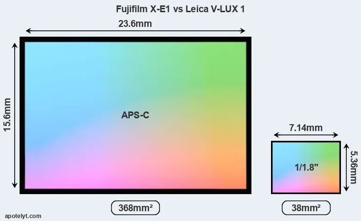 Of the two cameras under consideration, the Fujifilm X-E1 features an APS-C sensor and the Leica V-LUX 1 a 1/1.8-inch sensor. The sensor area in the V-LUX 1 is 90 percent smaller. As a result of these sensor size differences, the cameras have a format factor of, respectively, 1.5 and 4.8. The sensor in the X-E1 has a native 3:2 aspect ratio, while the one in the V-LUX 1 offers a 4:3 aspect.