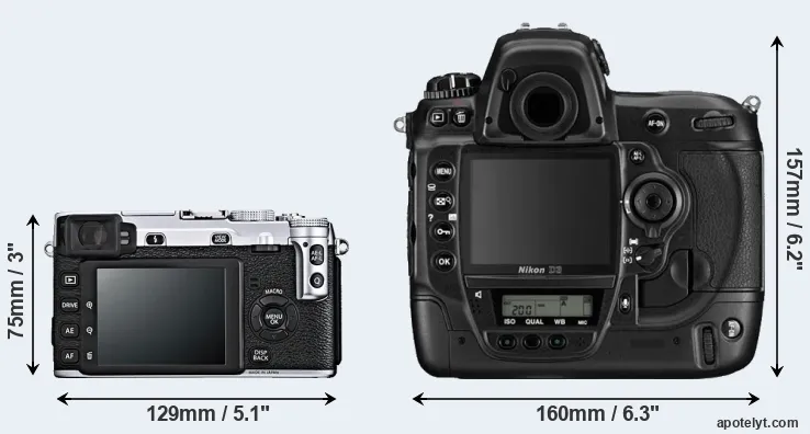 The side-by-side display below illustrates the physical size and weight of the Fujifilm X-E1 and the Nikon D3. The two cameras are presented according to their relative size. Three consecutive views from the front, the top, and the rear side are shown. All width, height and depth dimensions are rounded to the nearest millimeter.