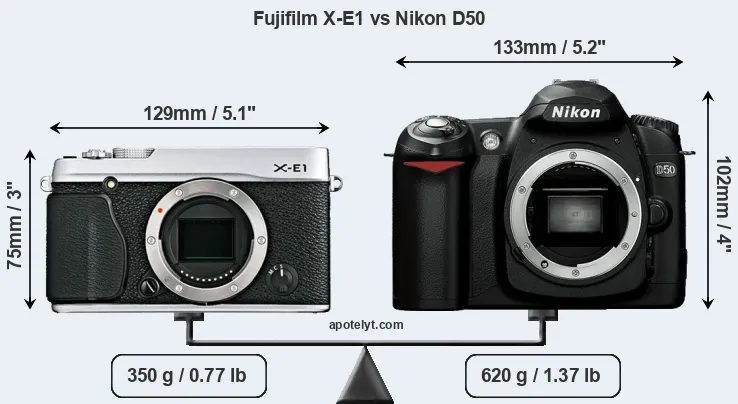 An illustration of the physical size and weight of the Fujifilm X-E1 and the Nikon D50 is provided in the side-by-side display below. The two cameras are presented according to their relative size. Three successive views from the front, the top, and the rear are shown. All size dimensions are rounded to the nearest millimeter.