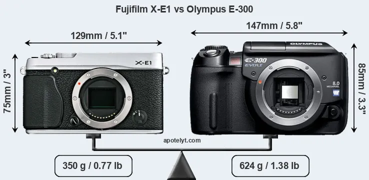 The physical size and weight of the Fujifilm X-E1 and the Olympus E-300 are illustrated in the side-by-side display below. The two cameras are presented according to their relative size. Three consecutive perspectives from the front, the top, and the back are available. All width, height and depth measures are rounded to the nearest millimeter.