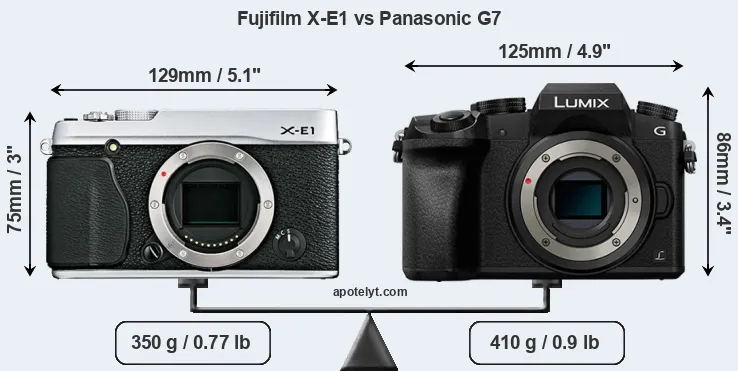 An illustration of the physical size and weight of the Fujifilm X-E1 and the Panasonic G7 is provided in the side-by-side display below. The two cameras are presented according to their relative size. Three consecutive perspectives from the front, the top, and the back are available. All width, height and depth measures are rounded to the nearest millimeter.