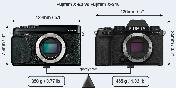 If the front view area (width x height) of the cameras is taken as an aggregate measure of their size, the Fujifilm X-S10 is notably larger (11 percent) than the Fujifilm X-E2. Moreover, the X-S10 is markedly heavier (33 percent) than the X-E2. In this context, it is worth noting that neither the X-E2 nor the X-S10 are weather-sealed.