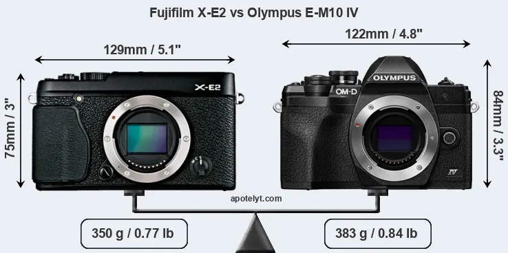 An illustration of the physical size and weight of the Fujifilm X-E2 and the Olympus E-M10 IV is provided in the side-by-side display below. The two cameras are presented according to their relative size. Three consecutive views from the front, the top, and the rear side are shown. All width, height and depth measures are rounded to the nearest millimeter.