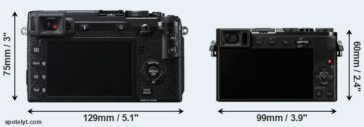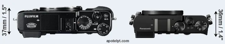 The side-by-side display below illustrates the physical size and weight of the Fujifilm X-E2 and the Panasonic GM5. The two cameras are presented according to their relative size. Three consecutive perspectives from the front, the top, and the back are available. All width, height and depth measures are rounded to the nearest millimeter.