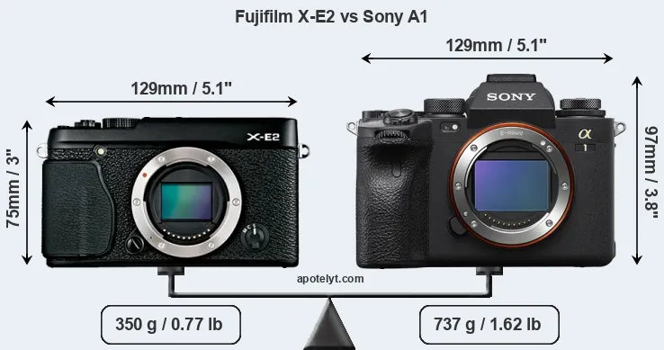 If the front view area (width x height) of the cameras is taken as an aggregate measure of their size, the Sony A1 is notably larger (29 percent) than the Fujifilm X-E2. Moreover, the A1 is substantially heavier (111 percent) than the X-E2. It is noteworthy in this context that the A1 is splash and dust-proof, while the X-E2 does not feature any corresponding weather-sealing.