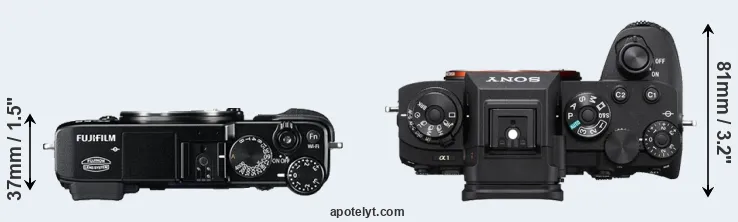 The side-by-side display below illustrates the physical size and weight of the Fujifilm X-E2 and the Sony A1. The two cameras are presented according to their relative size. Three consecutive views from the front, the top, and the rear side are shown. All width, height and depth dimensions are rounded to the nearest millimeter.