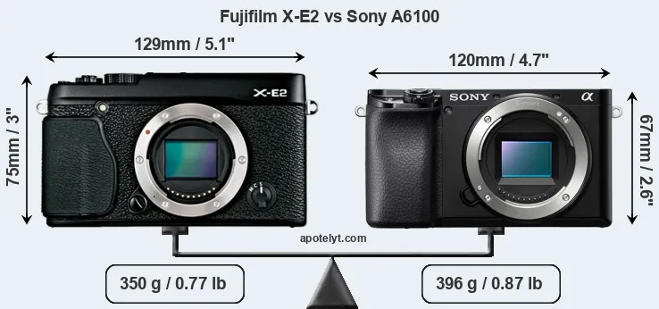 An illustration of the physical size and weight of the Fujifilm X-E2 and the Sony A6100 is provided in the side-by-side display below. The two cameras are presented according to their relative size. Three successive views from the front, the top, and the rear are shown. All size dimensions are rounded to the nearest millimeter.