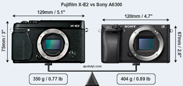 An illustration of the physical size and weight of the Fujifilm X-E2 and the Sony A6300 is provided in the side-by-side display below. The two cameras are presented according to their relative size. Three successive views from the front, the top, and the rear are shown. All size dimensions are rounded to the nearest millimeter.