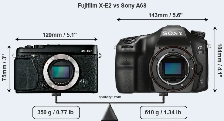 If the front view area (width x height) of the cameras is taken as an aggregate measure of their size, the Sony A68 is considerably larger (54 percent) than the Fujifilm X-E2. Moreover, the A68 is substantially heavier (74 percent) than the X-E2. In this context, it is worth noting that neither the X-E2 nor the A68 are weather-sealed.