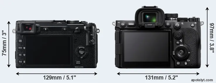 The side-by-side display below illustrates the physical size and weight of the Fujifilm X-E2 and the Sony A7R V. The two cameras are presented according to their relative size. Three successive views from the front, the top, and the rear are shown. All width, height and depth measures are rounded to the nearest millimeter.