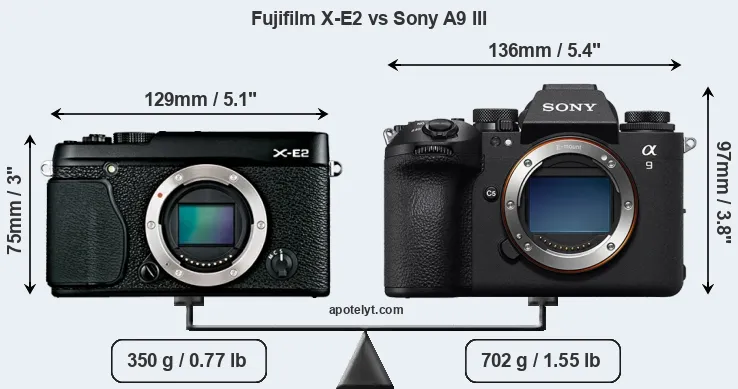 If the front view area (width x height) of the cameras is taken as an aggregate measure of their size, the Sony A9 III is notably larger (36 percent) than the Fujifilm X-E2. Moreover, the A9 III is substantially heavier (101 percent) than the X-E2. It is noteworthy in this context that the A9 III is splash and dust-proof, while the X-E2 does not feature any corresponding weather-sealing.