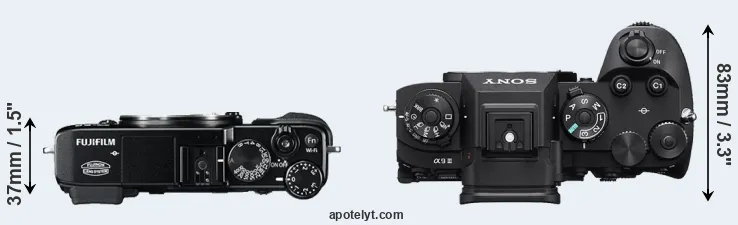 The side-by-side display below illustrates the physical size and weight of the Fujifilm X-E2 and the Sony A9 III. The two cameras are presented according to their relative size. Three consecutive views from the front, the top, and the rear side are shown. All width, height and depth dimensions are rounded to the nearest millimeter.