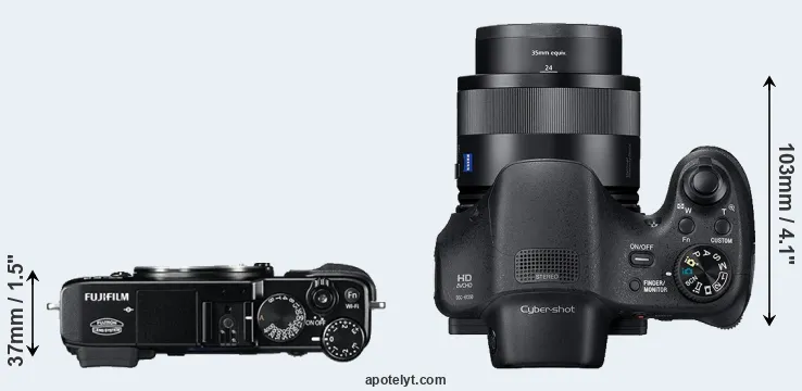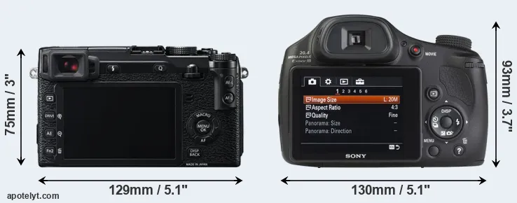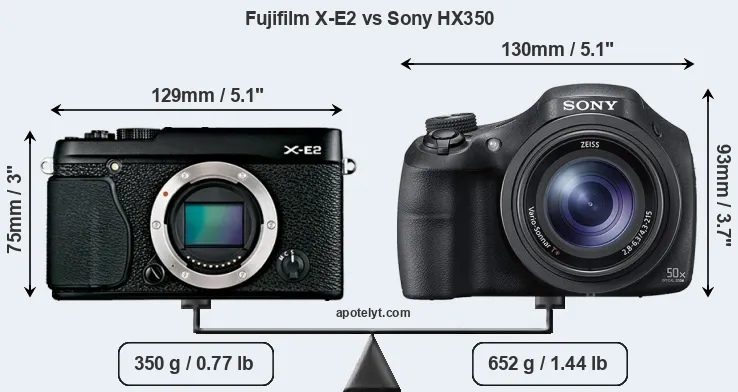 The physical size and weight of the Fujifilm X-E2 and the Sony HX350 are illustrated in the side-by-side display below. The two cameras are presented according to their relative size. Three successive views from the front, the top, and the rear are shown. All width, height and depth measures are rounded to the nearest millimeter.