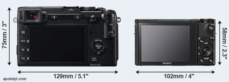 The physical size and weight of the Fujifilm X-E2 and the Sony RX100 V are illustrated in the side-by-side display below. The two cameras are presented according to their relative size. Three consecutive perspectives from the front, the top, and the back are available. All width, height and depth dimensions are rounded to the nearest millimeter.