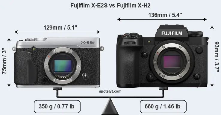 If the front view area (width x height) of the cameras is taken as an aggregate measure of their size, the Fujifilm X-H2 is notably larger (31 percent) than the Fujifilm X-E2S. Moreover, the X-H2 is substantially heavier (89 percent) than the X-E2S. It is noteworthy in this context that the X-H2 is splash and dust-proof, while the X-E2S does not feature any corresponding weather-sealing.