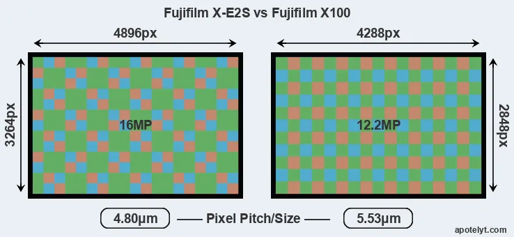 Despite having a slightly smaller sensor, the Fujifilm X-E2S offers a higher resolution of 16 megapixels, compared with 12.2 MP of the Fujifilm X100. This megapixels advantage comes at the cost of a higher pixel density and a smaller size of the individual pixel (with a pixel pitch of 4.80μm versus 5.53μm for the X100). However, it should be noted that the X-E2S is much more recent (by 5 years and 3 months) than the X100, and its sensor will have benefitted from technological advances during this time that make it possible to gather light more efficiently. Coming back to sensor resolution, it should be mentioned that the X-E2S has no anti-alias filter installed, so that it can capture all the detail its sensor resolves.