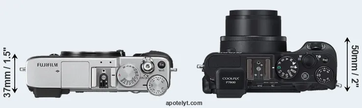 If the front view area (width x height) of the cameras is taken as an aggregate measure of their size, the Nikon P7800 is somewhat smaller (4 percent) than the Fujifilm X-E2S. In this context, it is worth noting that neither the X-E2S nor the P7800 are weather-sealed.