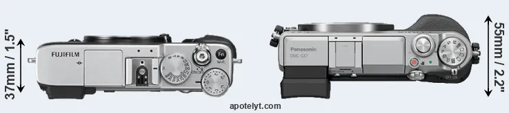 The side-by-side display below illustrates the physical size and weight of the Fujifilm X-E2S and the Panasonic GX7. The two cameras are presented according to their relative size. Three successive views from the front, the top, and the rear are shown. All size dimensions are rounded to the nearest millimeter.