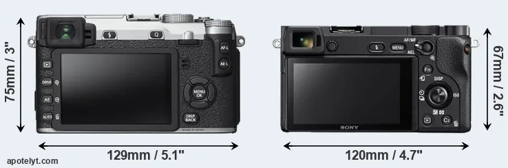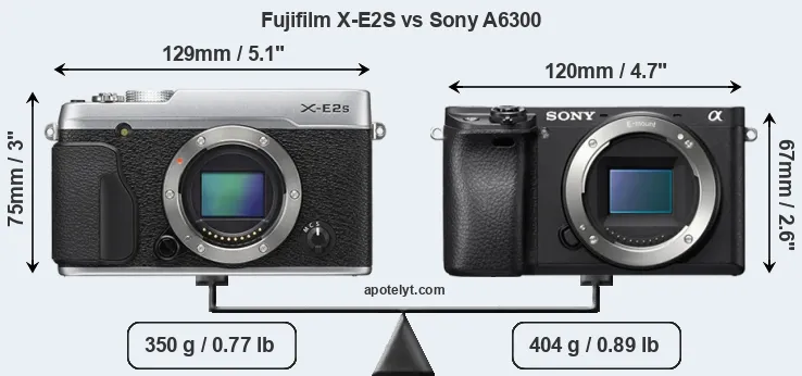 The side-by-side display below illustrates the physical size and weight of the Fujifilm X-E2S and the Sony A6300. The two cameras are presented according to their relative size. Three successive views from the front, the top, and the rear are shown. All width, height and depth measures are rounded to the nearest millimeter.