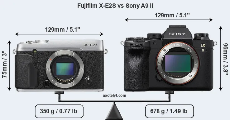 If the front view area (width x height) of the cameras is taken as an aggregate measure of their size, the Sony A9 II is notably larger (28 percent) than the Fujifilm X-E2S. Moreover, the A9 II is substantially heavier (94 percent) than the X-E2S. It is noteworthy in this context that the A9 II is splash and dust-proof, while the X-E2S does not feature any corresponding weather-sealing.