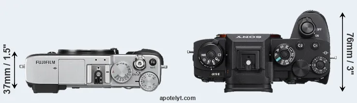 The physical size and weight of the Fujifilm X-E2S and the Sony A9 II are illustrated in the side-by-side display below. The two cameras are presented according to their relative size. Three successive views from the front, the top, and the rear are shown. All width, height and depth dimensions are rounded to the nearest millimeter.