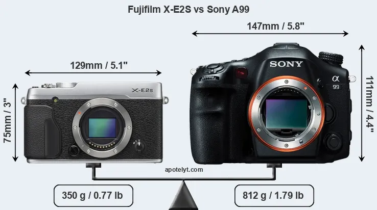 If the front view area (width x height) of the cameras is taken as an aggregate measure of their size, the Sony A99 is considerably larger (69 percent) than the Fujifilm X-E2S. Moreover, the A99 is substantially heavier (132 percent) than the X-E2S. It is noteworthy in this context that the A99 is splash and dust-proof, while the X-E2S does not feature any corresponding weather-sealing.