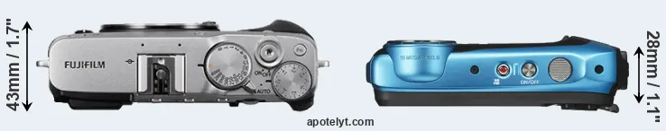 The side-by-side display below illustrates the physical size and weight of the Fujifilm X-E3 and the Fujifilm XP140. The two cameras are presented according to their relative size. Three consecutive perspectives from the front, the top, and the back are available. All width, height and depth dimensions are rounded to the nearest millimeter.