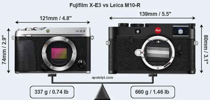 If the front view area (width x height) of the cameras is taken as an aggregate measure of their size, the Leica M10-R is notably larger (24 percent) than the Fujifilm X-E3. Moreover, the M10-R is substantially heavier (96 percent) than the X-E3. It is noteworthy in this context that the M10-R is splash and dust-proof, while the X-E3 does not feature any corresponding weather-sealing.