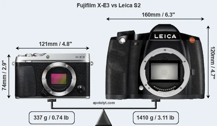 The physical size and weight of the Fujifilm X-E3 and the Leica S2 are illustrated in the side-by-side display below. The two cameras are presented according to their relative size. Three consecutive perspectives from the front, the top, and the back are available. All width, height and depth measures are rounded to the nearest millimeter.
