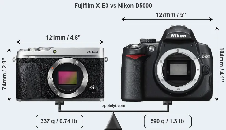 If the front view area (width x height) of the cameras is taken as an aggregate measure of their size, the Nikon D5000 is considerably larger (48 percent) than the Fujifilm X-E3. Moreover, the D5000 is substantially heavier (75 percent) than the X-E3. In this context, it is worth noting that neither the X-E3 nor the D5000 are weather-sealed.