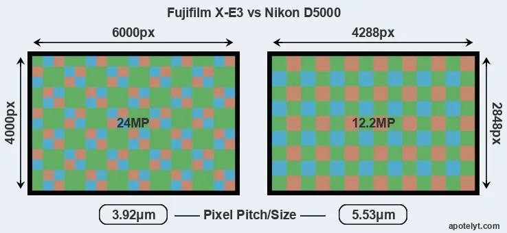 Despite having a slightly smaller sensor, the Fujifilm X-E3 offers a higher resolution of 24 megapixels, compared with 12.2 MP of the Nikon D5000. This megapixels advantage comes at the cost of a higher pixel density and a smaller size of the individual pixel (with a pixel pitch of 3.92μm versus 5.53μm for the D5000). However, it should be noted that the X-E3 is much more recent (by 8 years and 4 months) than the D5000, and its sensor will have benefitted from technological advances during this time that make it possible to gather light more efficiently. Coming back to sensor resolution, it should be mentioned that the X-E3 has no anti-alias filter installed, so that it can capture all the detail its sensor resolves.