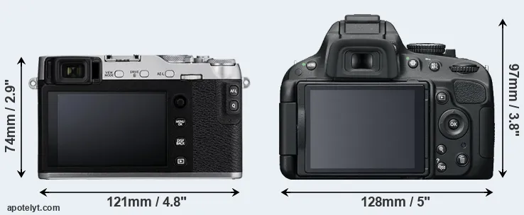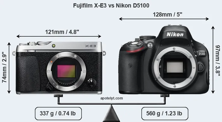 The side-by-side display below illustrates the physical size and weight of the Fujifilm X-E3 and the Nikon D5100. The two cameras are presented according to their relative size. Three consecutive perspectives from the front, the top, and the back are available. All width, height and depth measures are rounded to the nearest millimeter.