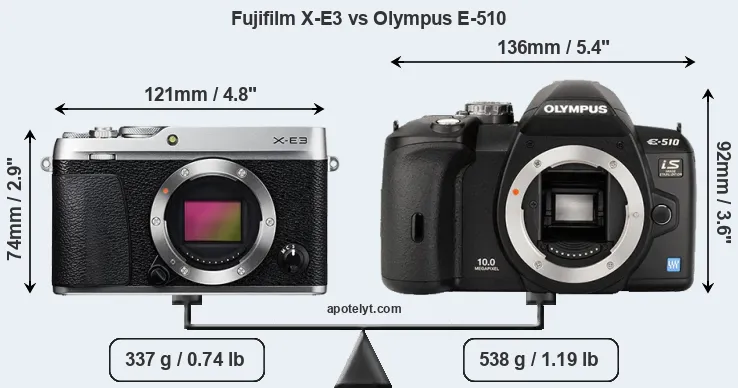 An illustration of the physical size and weight of the Fujifilm X-E3 and the Olympus E-510 is provided in the side-by-side display below. The two cameras are presented according to their relative size. Three consecutive views from the front, the top, and the rear side are shown. All width, height and depth measures are rounded to the nearest millimeter.