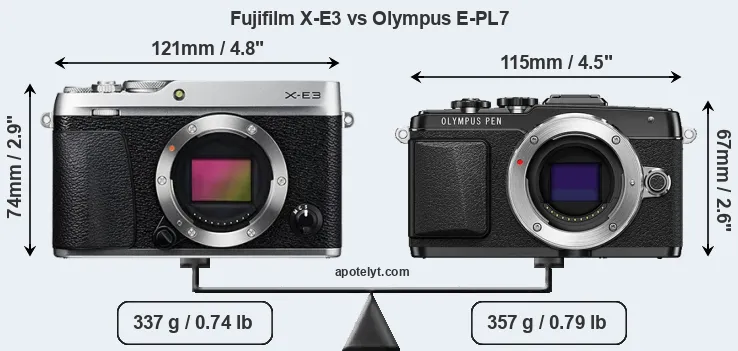 An illustration of the physical size and weight of the Fujifilm X-E3 and the Olympus E-PL7 is provided in the side-by-side display below. The two cameras are presented according to their relative size. Three successive views from the front, the top, and the rear are shown. All width, height and depth dimensions are rounded to the nearest millimeter.
