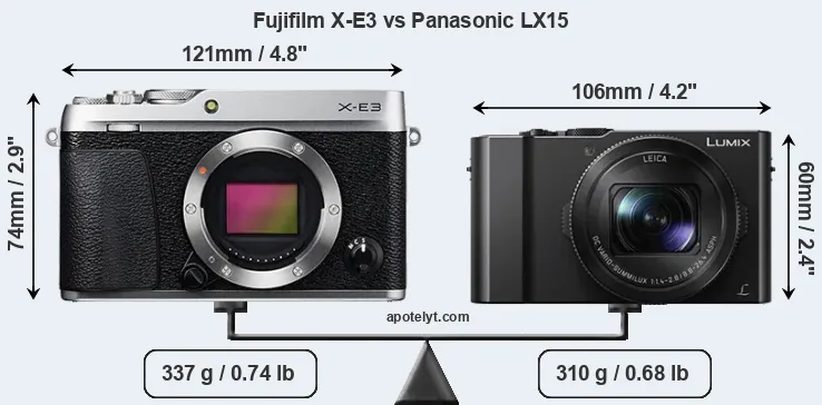 The side-by-side display below illustrates the physical size and weight of the Fujifilm X-E3 and the Panasonic LX15. The two cameras are presented according to their relative size. Three successive views from the front, the top, and the rear are shown. All width, height and depth measures are rounded to the nearest millimeter.
