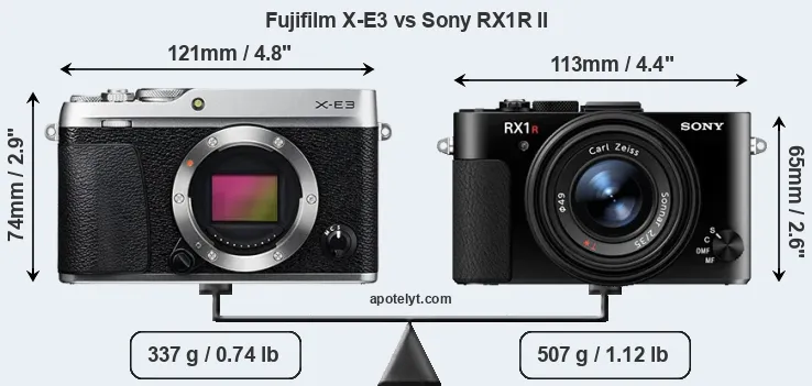 The side-by-side display below illustrates the physical size and weight of the Fujifilm X-E3 and the Sony RX1R II. The two cameras are presented according to their relative size. Three consecutive perspectives from the front, the top, and the back are available. All size dimensions are rounded to the nearest millimeter.