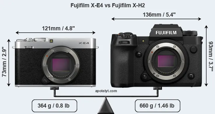 If the front view area (width x height) of the cameras is taken as an aggregate measure of their size, the Fujifilm X-H2 is considerably larger (43 percent) than the Fujifilm X-E4. Moreover, the X-H2 is substantially heavier (81 percent) than the X-E4. It is noteworthy in this context that the X-H2 is splash and dust-proof, while the X-E4 does not feature any corresponding weather-sealing.