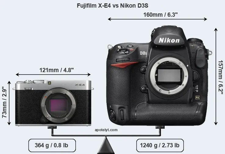 If the front view area (width x height) of the cameras is taken as an aggregate measure of their size, the Nikon D3S is considerably larger (184 percent) than the Fujifilm X-E4. Moreover, the D3S is substantially heavier (241 percent) than the X-E4. It is noteworthy in this context that the D3S is splash and dust-proof, while the X-E4 does not feature any corresponding weather-sealing.