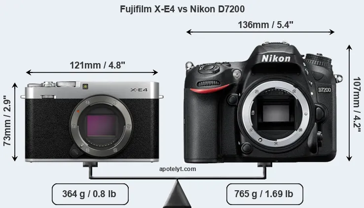 If the front view area (width x height) of the cameras is taken as an aggregate measure of their size, the Nikon D7200 is considerably larger (65 percent) than the Fujifilm X-E4. Moreover, the D7200 is substantially heavier (110 percent) than the X-E4. It is noteworthy in this context that the D7200 is splash and dust-proof, while the X-E4 does not feature any corresponding weather-sealing.