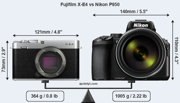 The above size and weight comparisons are to some extent incomplete and possibly misleading, as the P950 has a lens built in, whereas the X-E4 is an interchangeable lens camera that requires a separate lens. Attaching the latter will add extra weight and bulk to the setup. You can compare the optics available for the X-E4 and their specifications in the Fujinon X Lens Catalog.