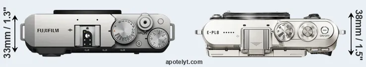 The side-by-side display below illustrates the physical size and weight of the Fujifilm X-E4 and the Olympus E-PL8. The two cameras are presented according to their relative size. Three successive views from the front, the top, and the rear are shown. All size dimensions are rounded to the nearest millimeter.