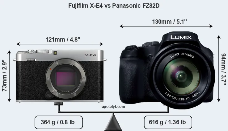 An illustration of the physical size and weight of the Fujifilm X-E4 and the Panasonic FZ82D is provided in the side-by-side display below. The two cameras are presented according to their relative size. Three consecutive perspectives from the front, the top, and the back are available. All width, height and depth measures are rounded to the nearest millimeter.